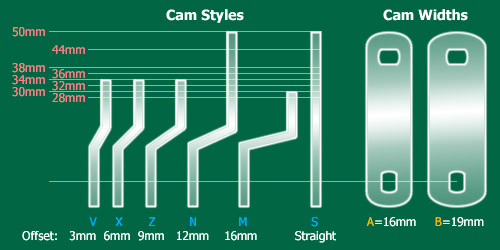 To order cams, simply specify the letter corresponding to the cam style, followed by the letter for the cam width, and finally the effective length in mm (from hole to end).